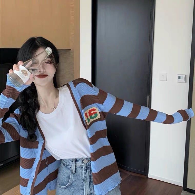 2021秋季新款设计感小众V领条纹针织开衫女韩版显瘦减龄外套上衣热门设计联盟服务商