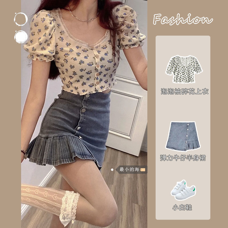 炸街设计感牛仔裙两件套装女夏新款半身短裙收腰蕾丝碎花短袖上衣热门设计联盟服务商