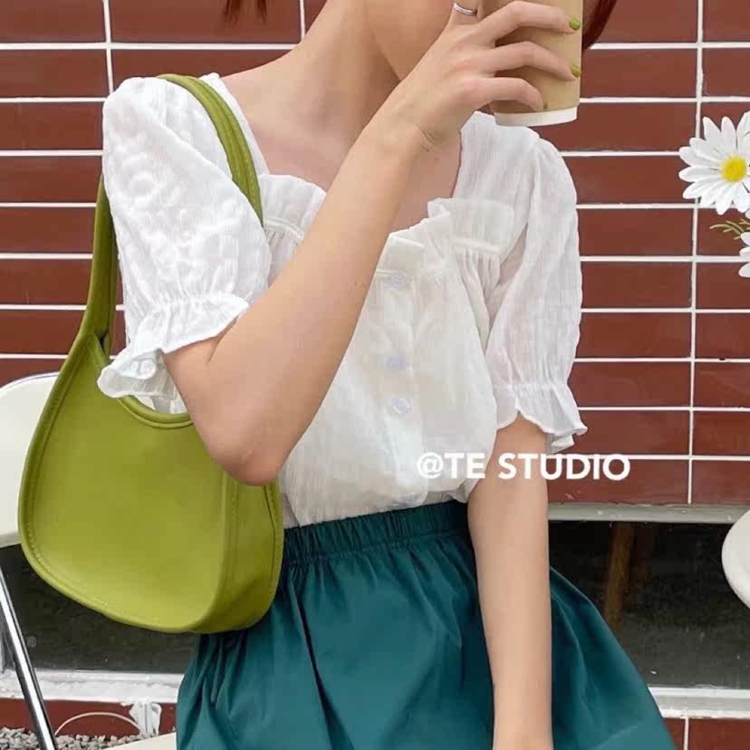 白衬衫新款其他纯色女方领套头泡泡袖短袖常规款直筒褶皱上衣春装热门设计联盟服务商