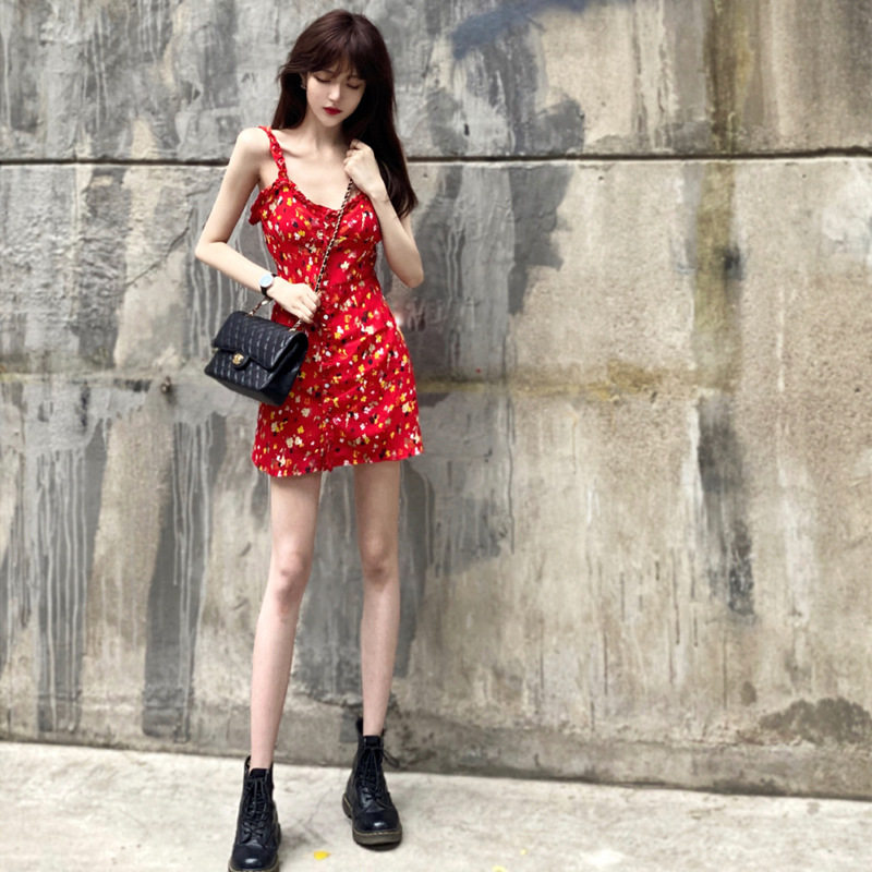 红色碎花连衣裙女夏2021年新款气质设计感小众小个子性感吊带裙子热门设计联盟服务商