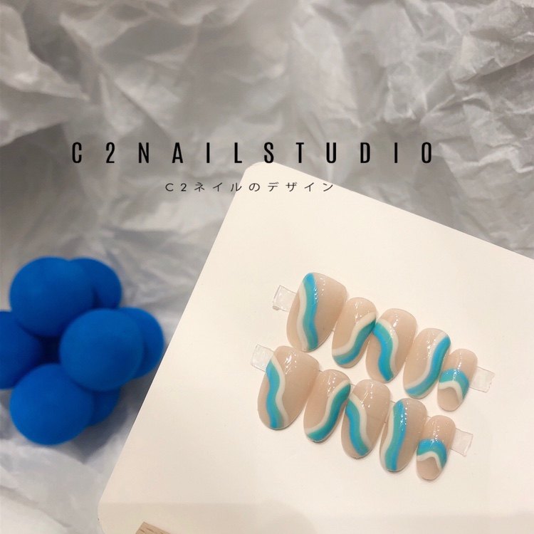 C2手工定制光疗成品美甲 韩风气质艺术线条设计裸色可穿戴甲片热门设计联盟服务商