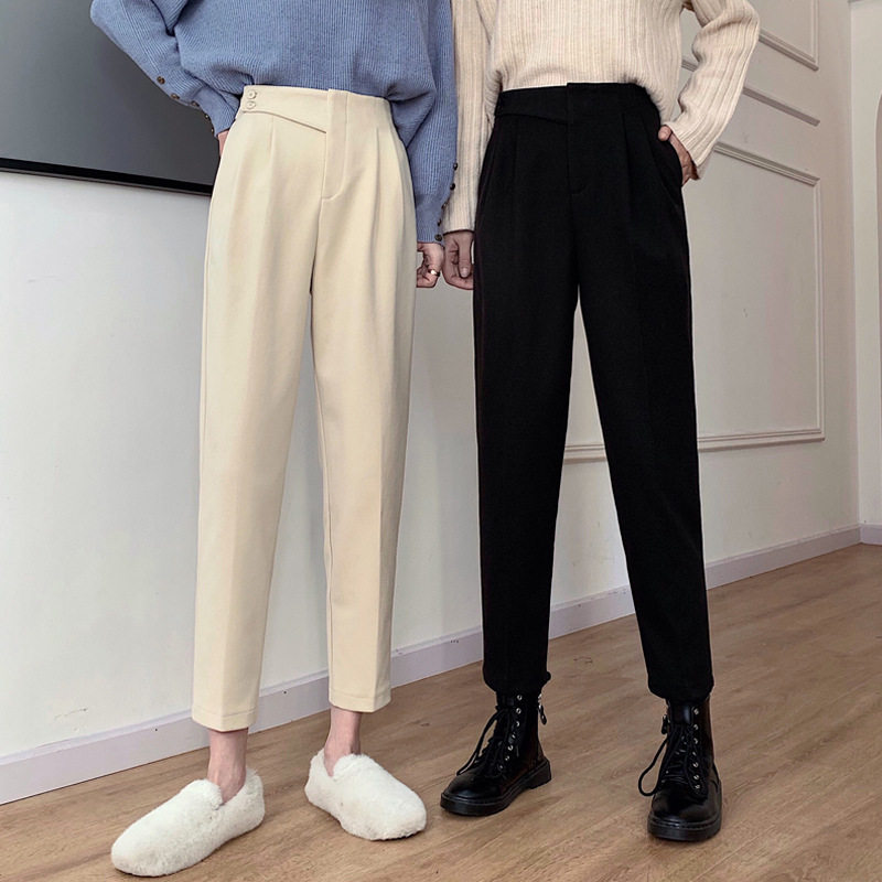 2021新春秋冬纯色设计感加厚毛呢双扣直筒裤女显瘦休闲裤子热门设计联盟服务商