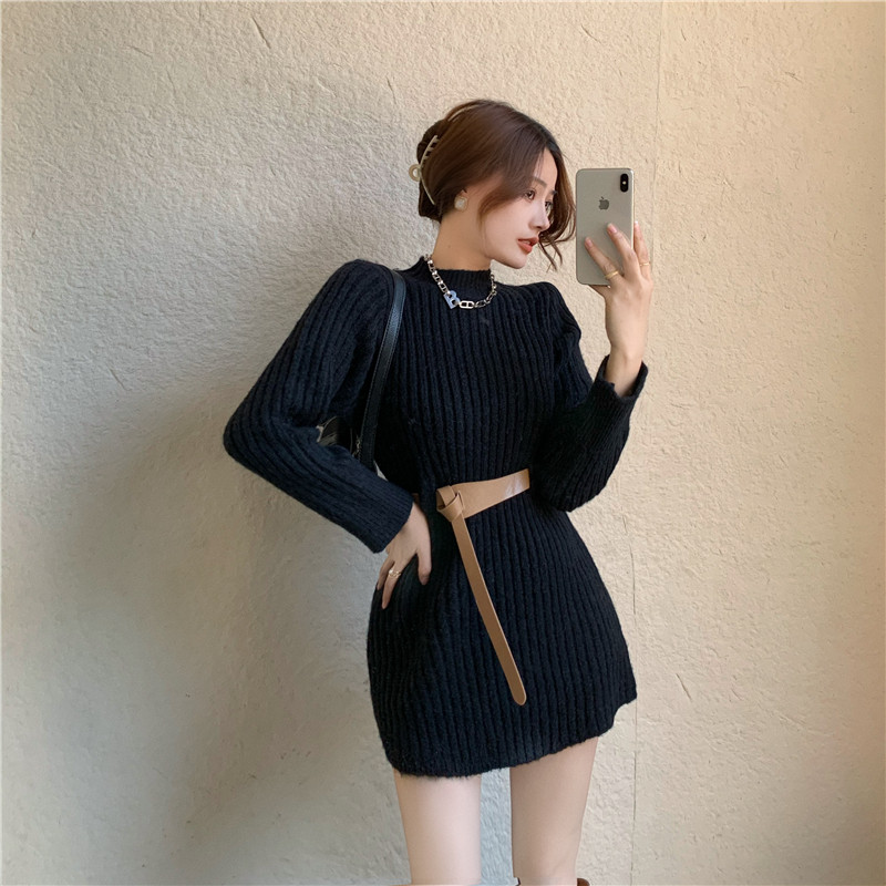 价韩设计感收腰包臀圆领配腰带毛线连衣裙上衣热门设计联盟服务商
