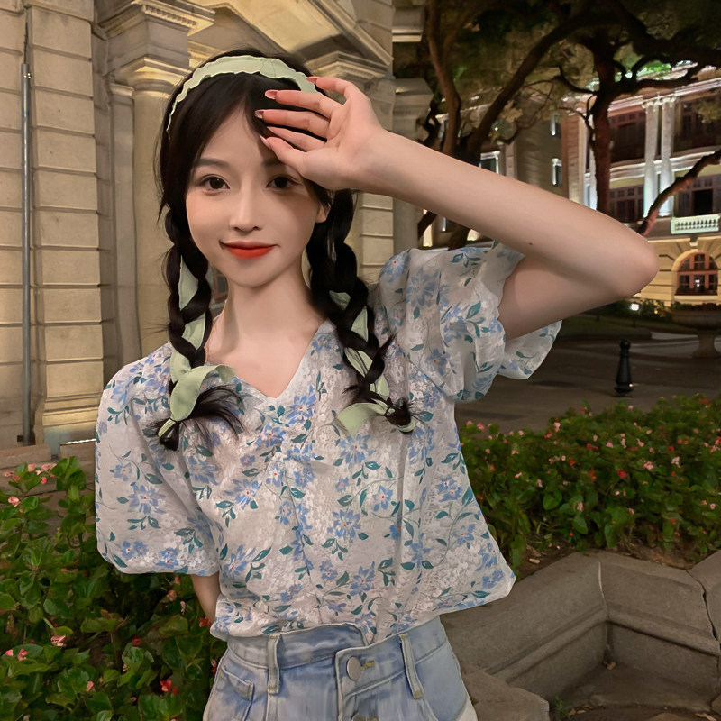 夏季新款设计感碎花薄款泡泡袖v领短款上衣热门设计联盟服务商