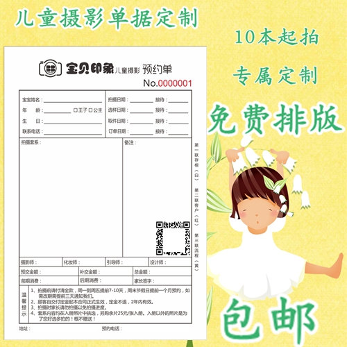 儿童影楼预约单摄影预约单二联婚纱婚庆订单合同本单据定做艺术照热门设计联盟服务商