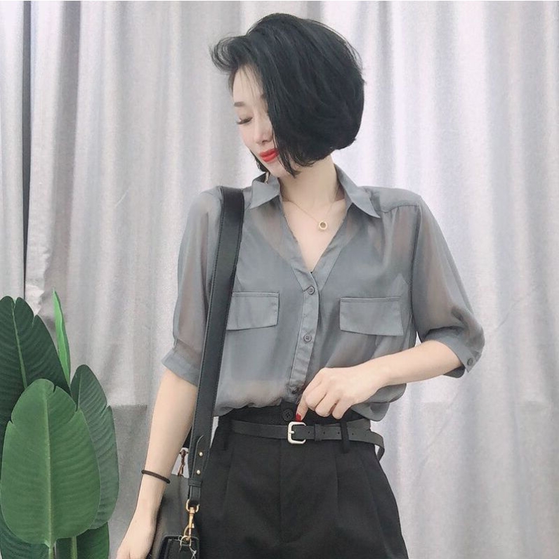 灰色衬衫女微透洋气性感打底衫小众设计感2021夏新款POLO领衬衣潮热门设计联盟服务商