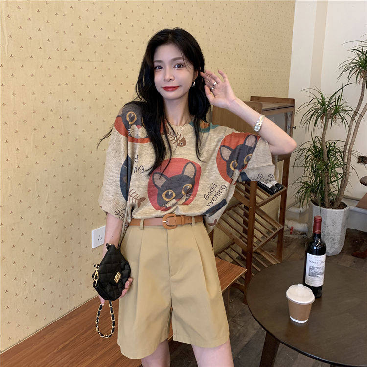 2021新款时尚套装女夏宽松印花薄针织短袖t恤+高腰工装短裤两件套热门设计联盟服务商