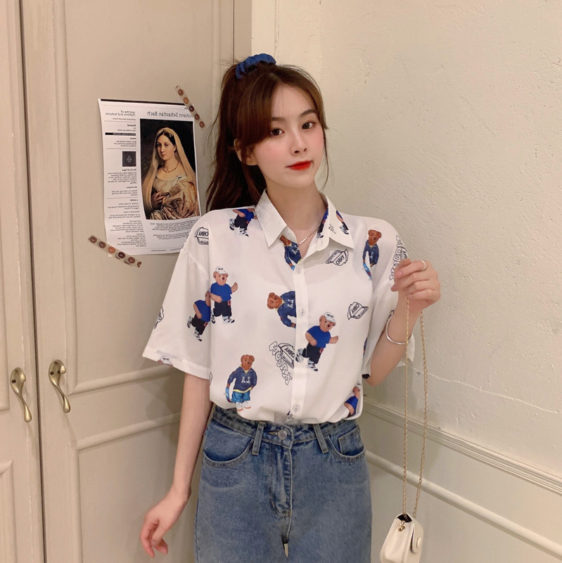 女装2021年夏季新款小熊印花衬衫女短袖韩版宽松设计感小众衬衣潮热门设计联盟服务商