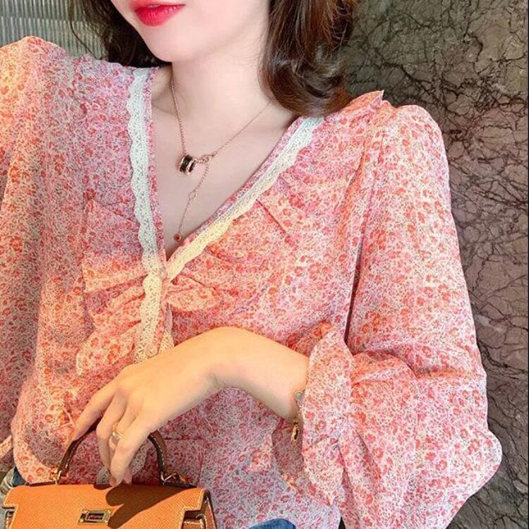 春夏洋气粉色碎花雪纺衬衫女设计感气质韩风chic荷叶边喇叭袖上衣热门设计联盟服务商