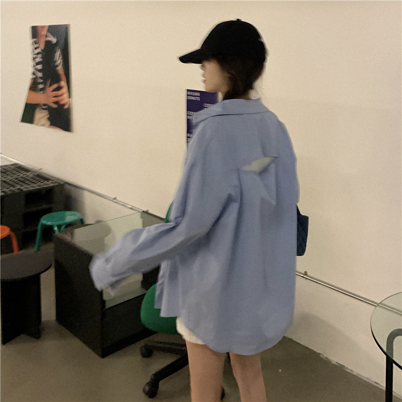 长袖衬衫女2021秋季新款韩版宽松后背镂空设计感洋气纯色衬衣潮热门设计联盟服务商
