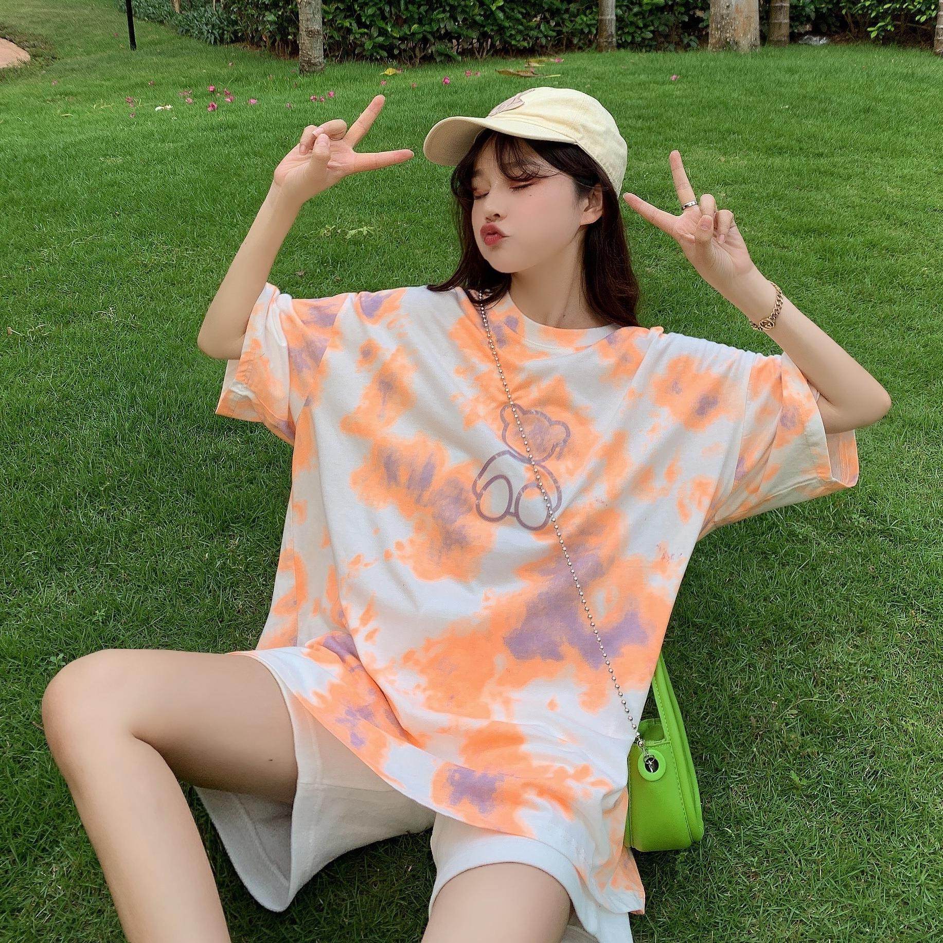 t恤女设计感时尚2021夏新款韩版宽松网红小熊扎染印花中长款上衣热门设计联盟服务商