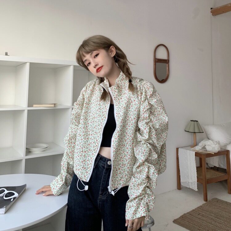 春季韩版宽松设计感皱褶袖短款碎花长袖外套上衣女学生热门设计联盟服务商