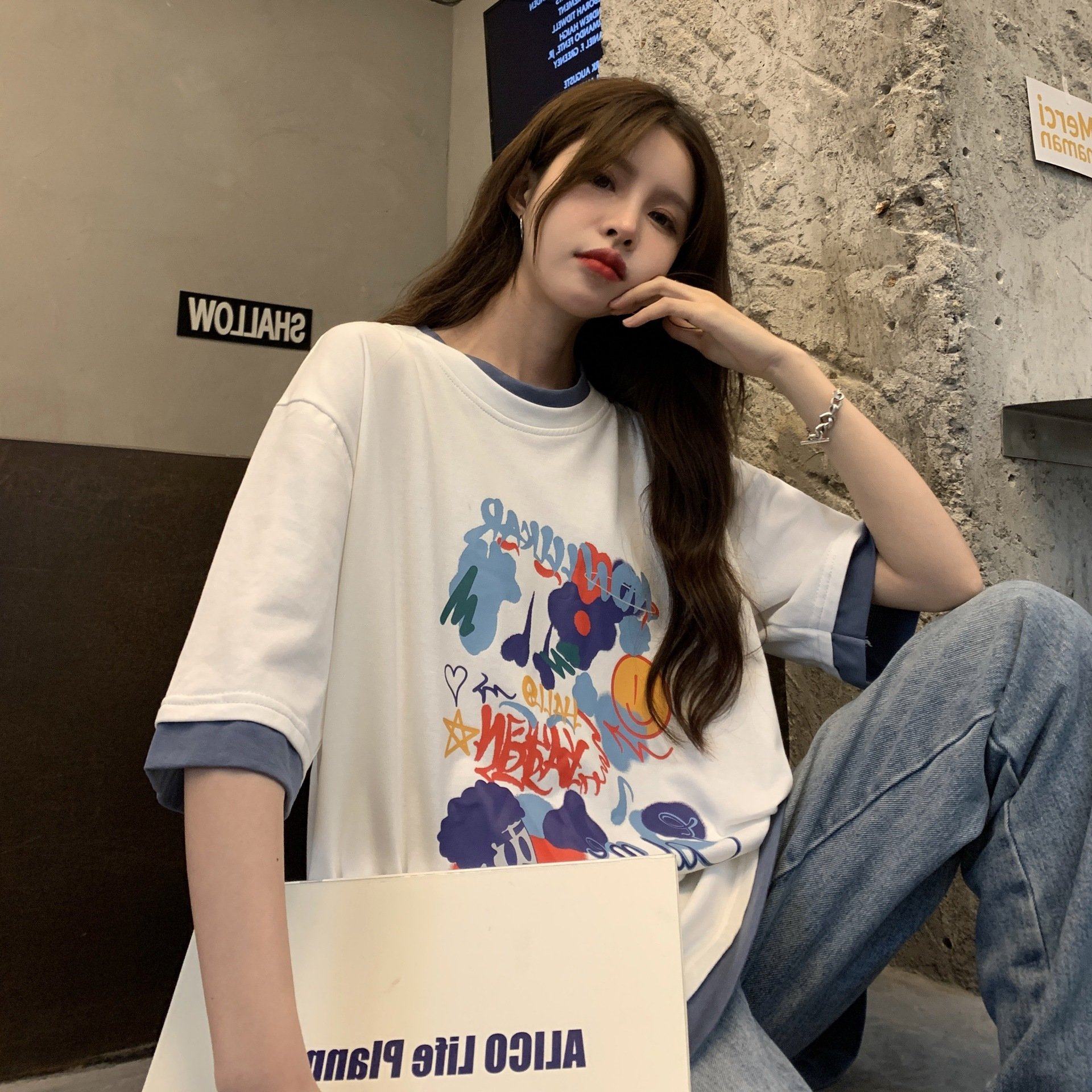 短袖白色t恤女设计感大码韩版宽松撞色假两件上衣女情侣装半袖女热门设计联盟服务商