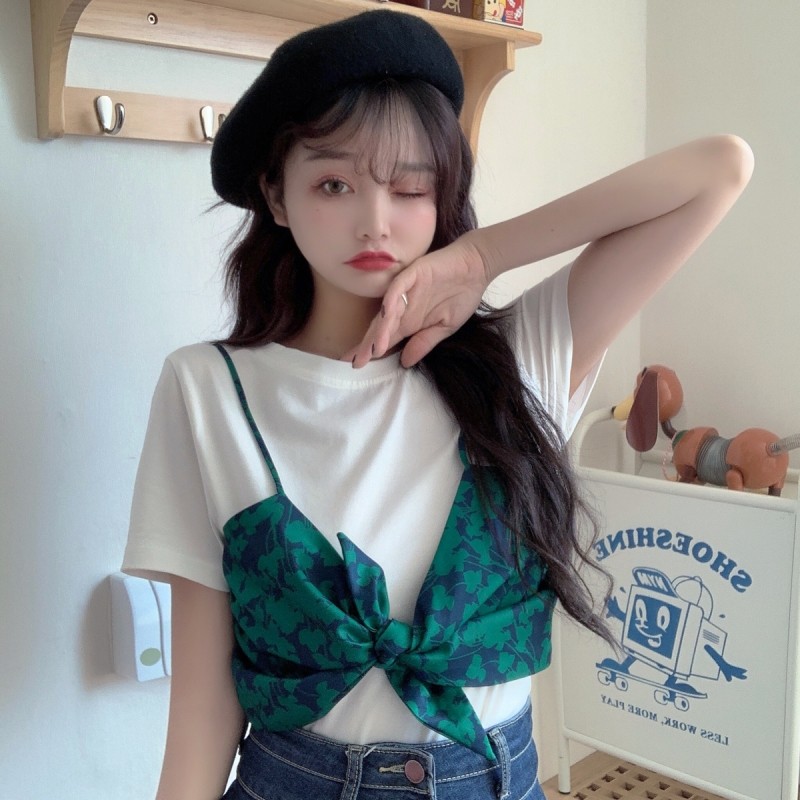2021年新款吊带短袖T恤假两件套不规则拼接设计感女小众上衣女热门设计联盟服务商
