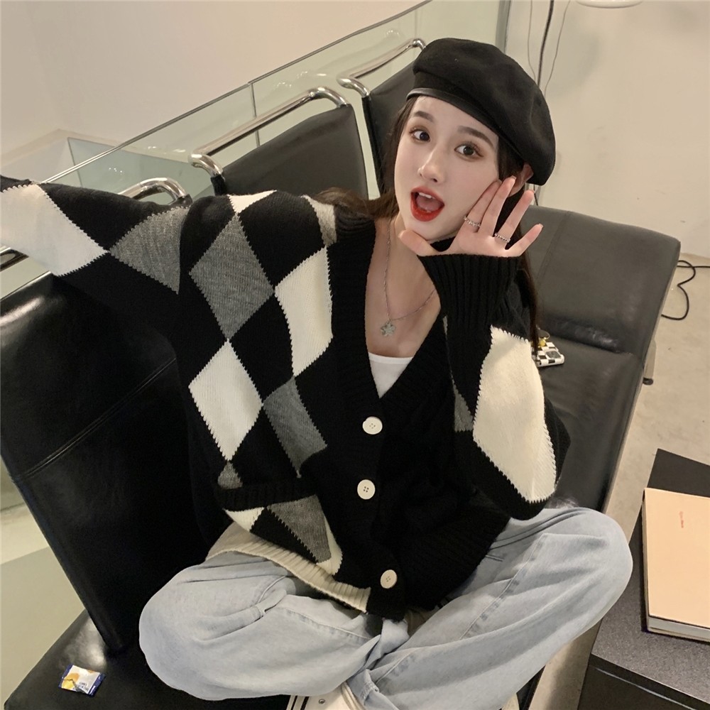 价设计感菱格长袖针织开衫女宽松黑色毛衣外套潮热门设计联盟服务商