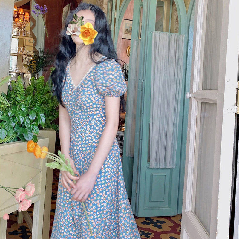 跨境短袖其他碎花连衣裙夏季新款修身显瘦V领法式泡泡袖裙子潮热门设计联盟服务商