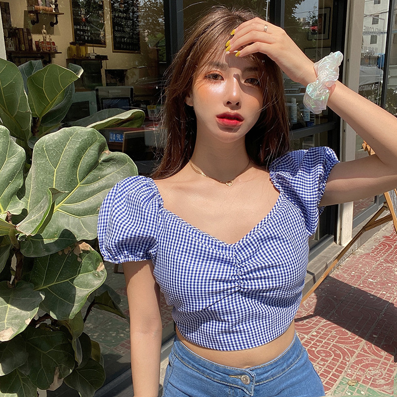 2021新款夏季韩版格子衬衫小众设计感衬衣方领短袖修身上衣热门设计联盟服务商