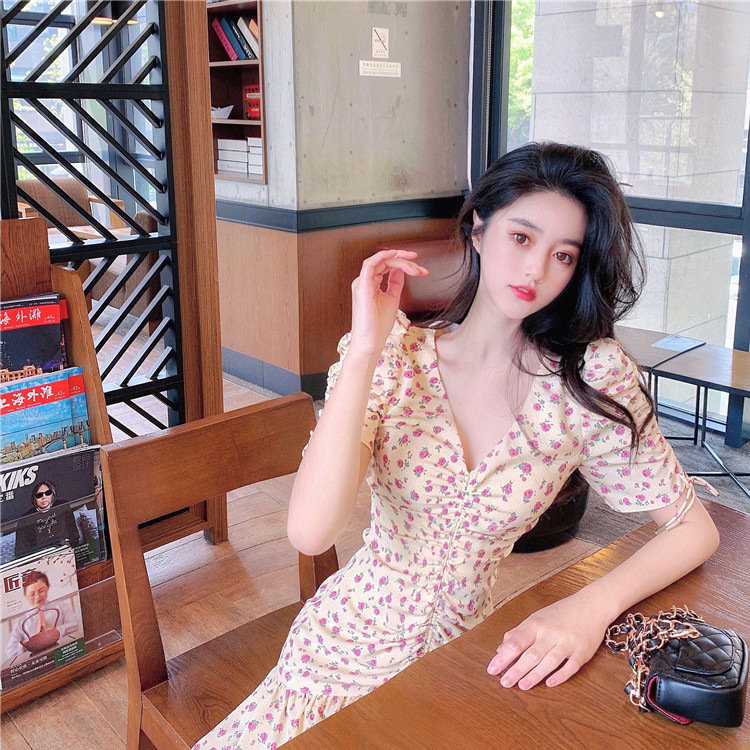 裙女法式复古抽绳收腰气质设计感褶皱领鱼尾显瘦夏季碎花连衣裙热门设计联盟服务商