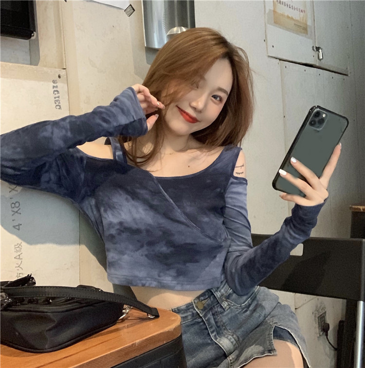 夏季韩版短款扎染长袖上衣设计感锁骨露肩露肩恤女新款心机热门设计联盟服务商