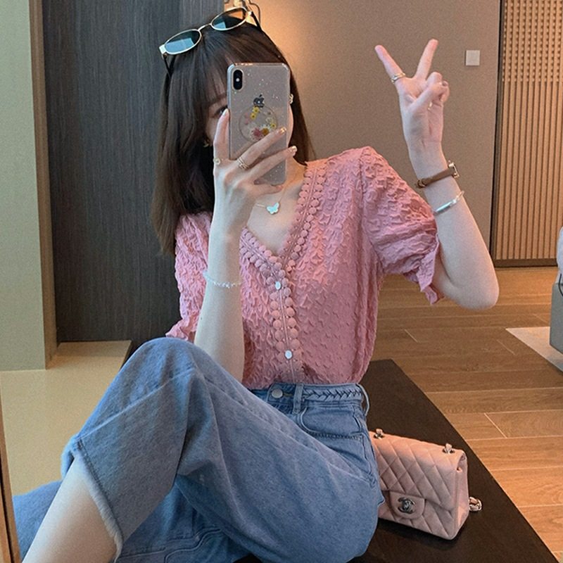 夏季甜美泡泡袖短款上衣法式轻熟温柔风衬衫女设计感短袖衬衣热门设计联盟服务商