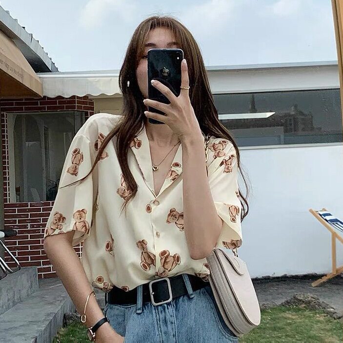 小熊印花衬衫女设计感复古港味夏季2021新款法式短袖衬衣雪纺上衣热门设计联盟服务商