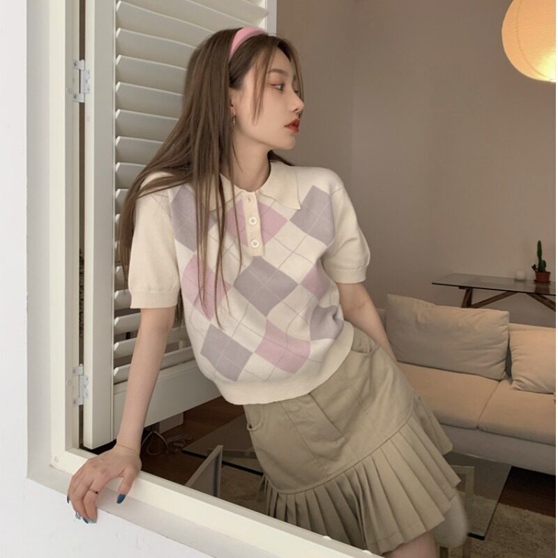 复古菱格polo领短袖T恤女薄款夏季2021新款设计感小众针织热门设计联盟服务商