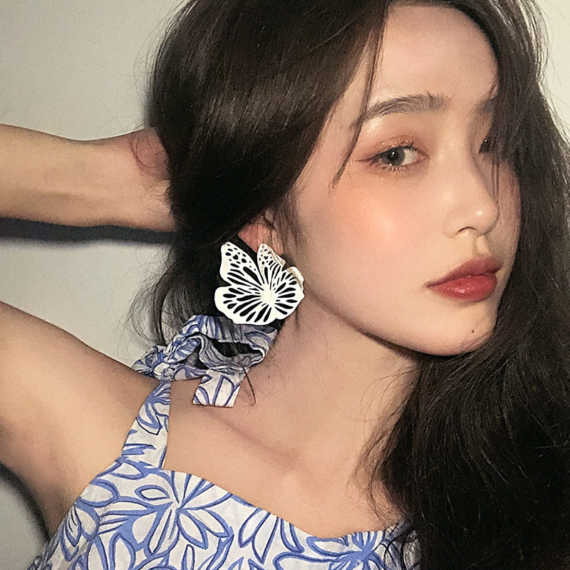 夸胀洛克白色金属镂空蝴蝶耳环设计感气质百搭耳钉S925银针耳饰热门设计联盟服务商